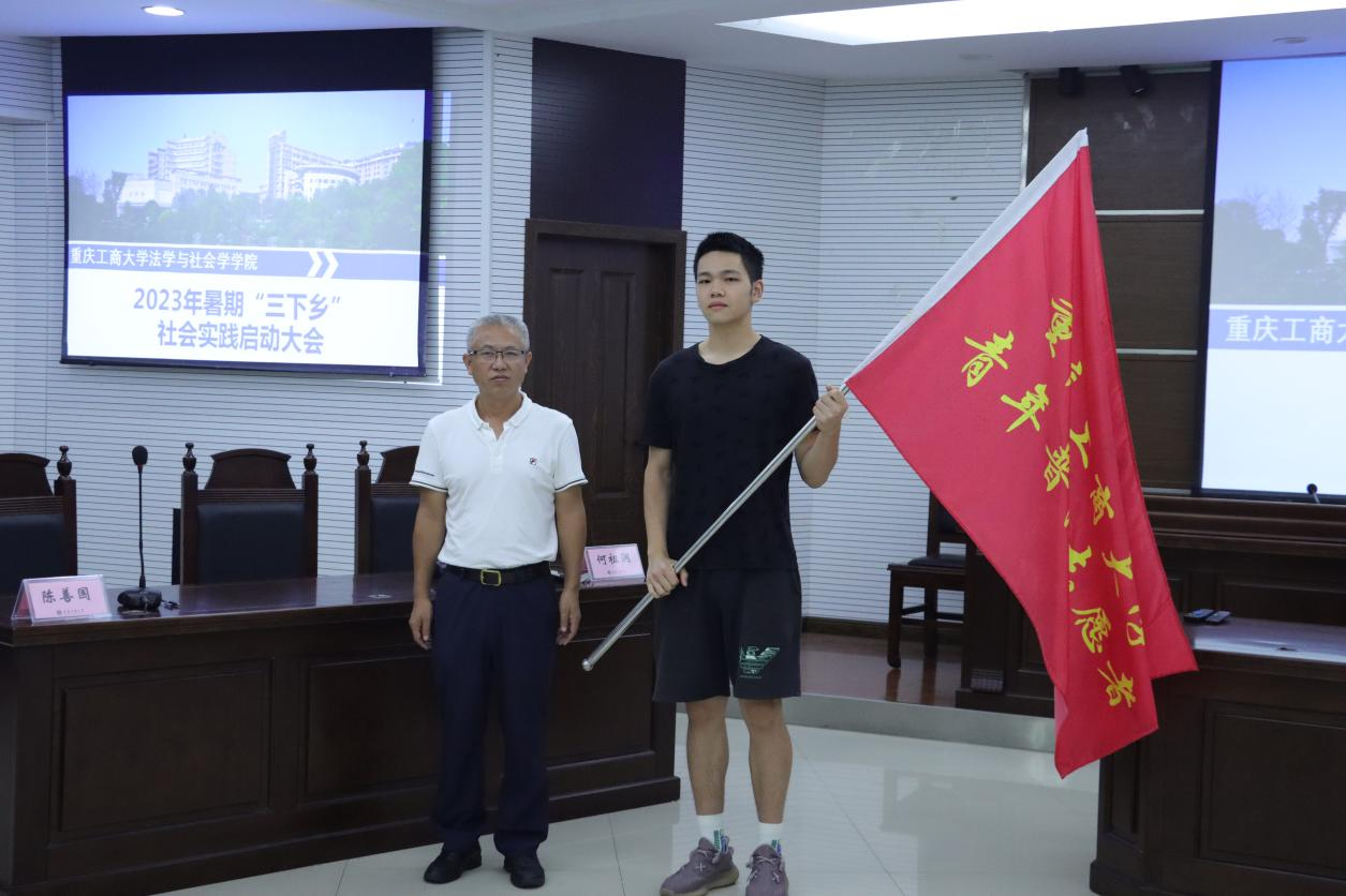 会上,陈善国代表学院党委作动员讲话。他向参加2023年暑期“三下乡”社会实践活动的志愿者们提出三点希望和要求:一是要以积极的心态和饱满的情绪走进基层面对群众,心怀“国之大者”,将个人发展的目标与党和国家的蓝图相结合;二是要时刻注意行为举止,以高标准严要求进行社会实践活动,用青春不断擦亮“重工商大名片”;三是要树立安全意识,严守安全红线,切实保障自身的人身安全、财产安全和信息安全。最后,他祝愿同学们在志愿服务过程中能有所收获有所感悟,取得圆满成绩,并为437ccm必赢国际青年普法志愿者服务队授旗,志愿者代表马梓翔接旗。