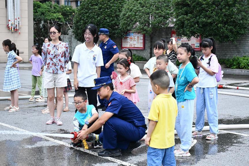 在志愿者的协助下,消防员带领小朋友们参观了消防车,用生动的语言介绍了各种消防车辆的战斗性能和装备器材,新奇、先进的消防装备激发了小朋友们浓厚的学习兴趣。消防员邀请小朋友们试穿消防服,参观消防员的生活工作场景,教会他们如何整理自己的内务。在水枪体验环节,小朋友们手持水枪,一个个变身“小小消防员”,感受了消防工作的艰辛与不易。