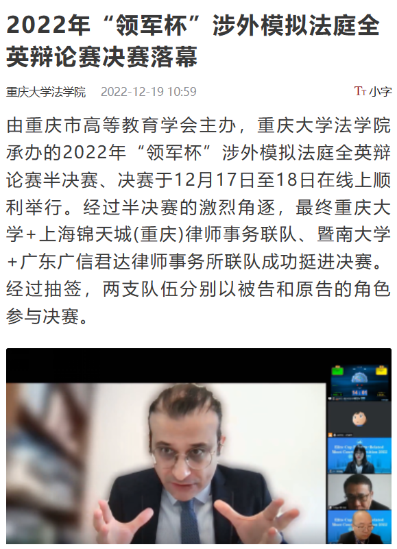 为创新涉外法治人才培养模式,增进法学院校与专业法律服务机构之间交流协作,推动完善以实践为导向的涉外法治人才培养机制,由重庆市高等教育学会主办,重庆大学法学院承办的2022领军杯涉外模拟法庭全英辩论赛半决赛、决赛于1217日至18日在线上顺利举行。