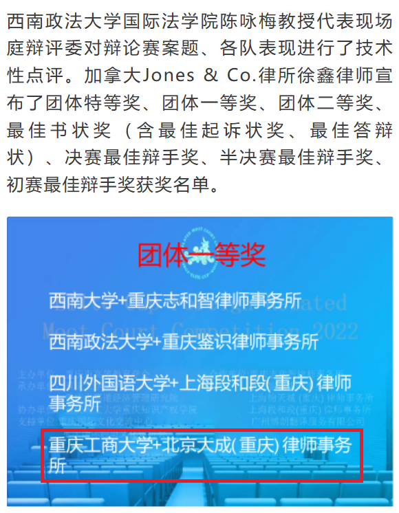 我院参赛队伍由法学系教师博士带队指导,选拔20级法学专业本科生周思延、21级法学专业本科生徐百合22级法律专业研究生蒋利平、21级法律专业研究生黄玉梅4同学组队,与北京大成(重庆)律师事务所律师共同参赛。经书状提交、初赛、半决赛、决赛等环节,我院师生最终取得优异成绩,荣获团体一等奖