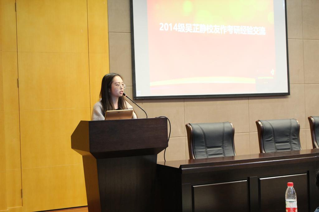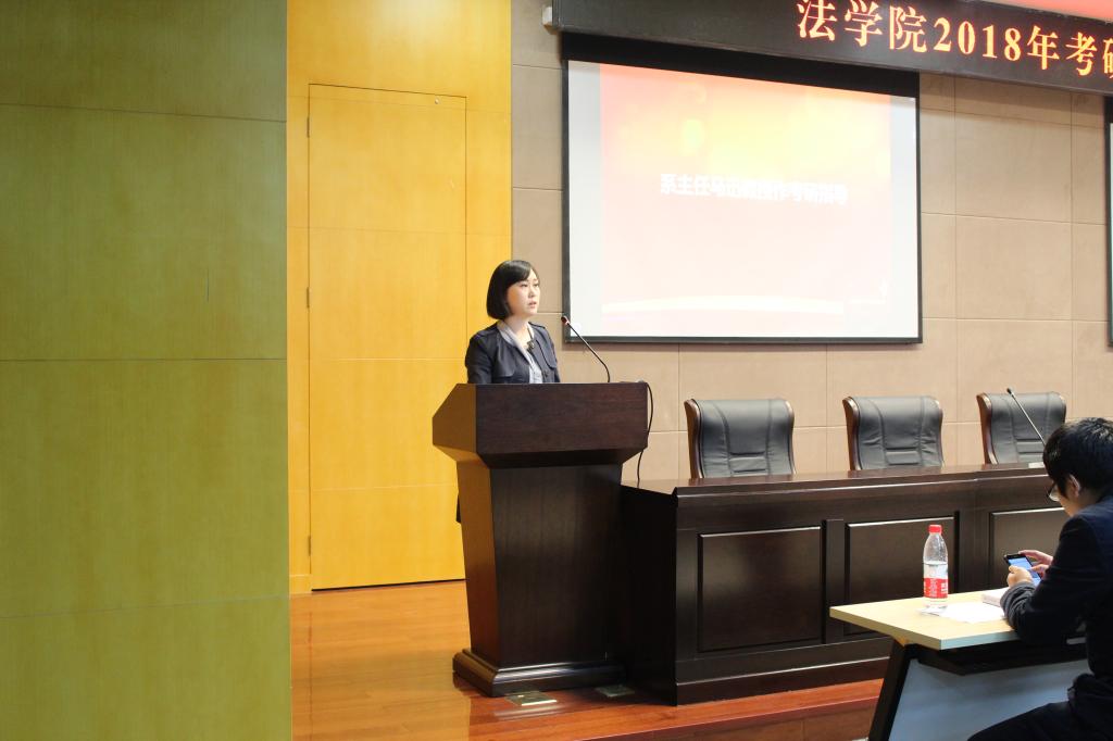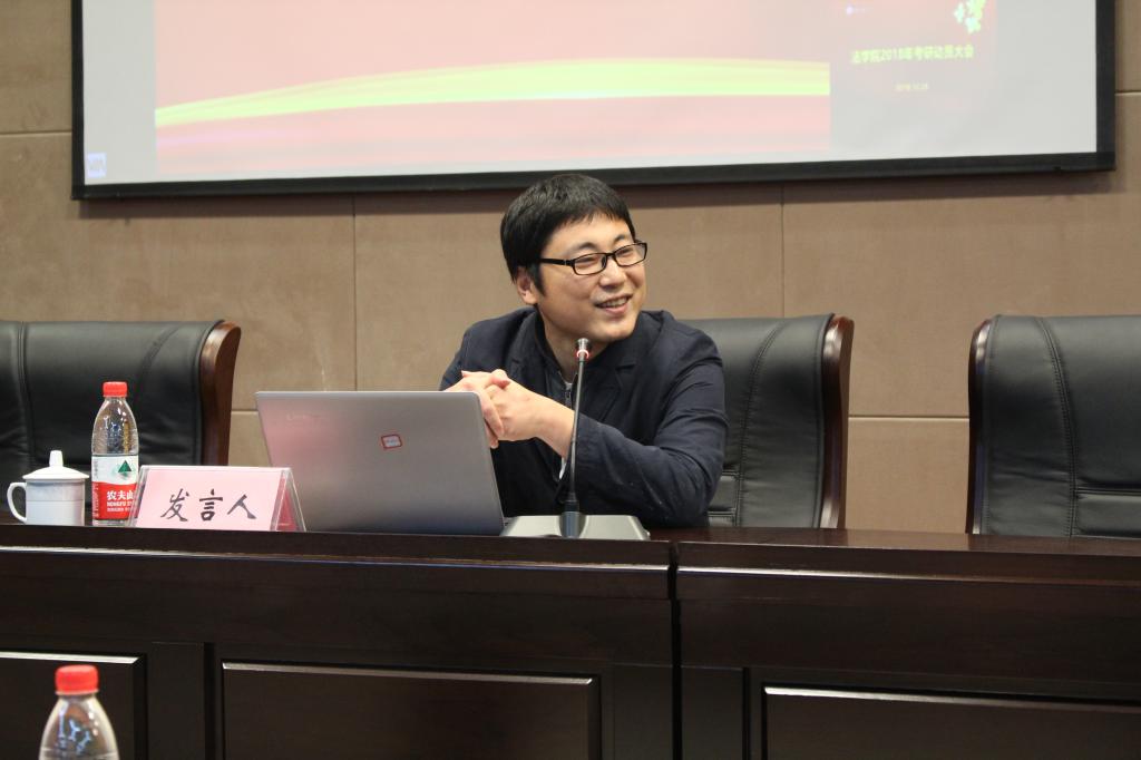 会议第二阶段,由2014级校友吴芷静作考研经验交流,她从选择学校、复习规划等方面介绍了自己的经验并提出建议,同时感谢母校,感谢法学院老师的教导与培养。接着,系主任马迅教授作考研指导,希望同学们结合自身的兴趣爱好、能力以及社会竞争等综合因素来决定考研,坚定信心,脚踏实地的学习,全心全意的投入到考研学习准备中。党总支副书记林璐讲到,学院在距离考研报名倒计时的时间里,召开动员会,既是对处于考研冲刺阶段的15级同学给予鼓劲和加油,也是动员16级同学正式启动考研备战模式,合理安排公共课和专业课的复习计划。同时,林书记还总结和分析了学院近几年的考研情况,对同学们提出了期望和要求。