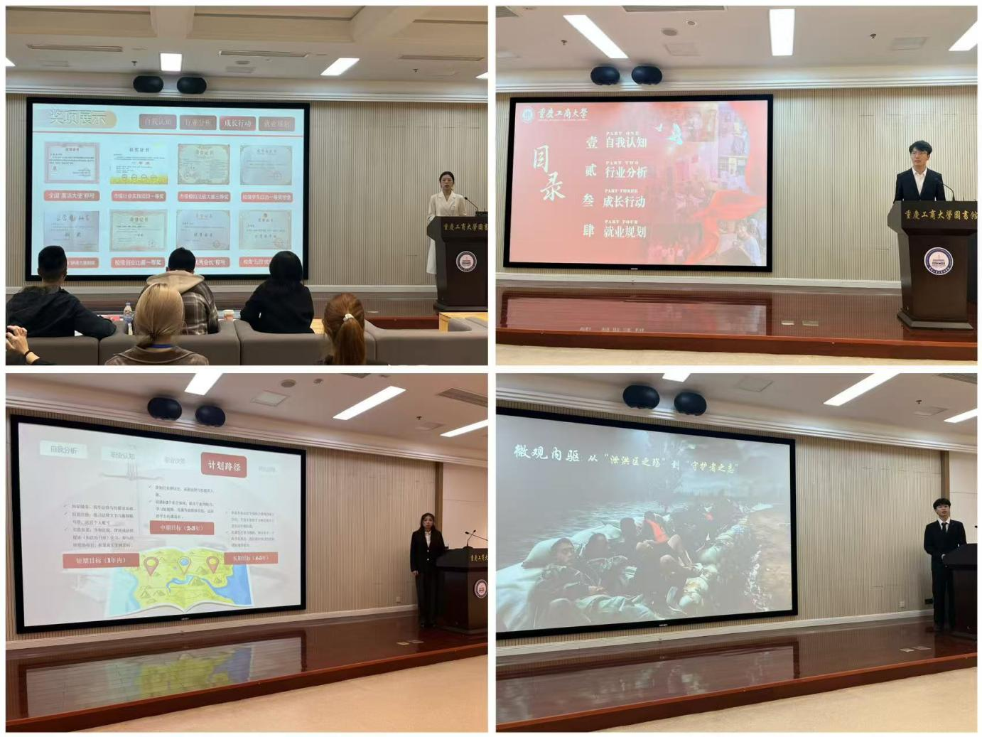 决赛设置成长赛道和就业赛道,经层层选拔,脱颖而出的13名本硕选手依次登台展示。展示环节中,选手们结合PPT系统阐述自身的职业发展目标、具体实施路径、可行性分析及动态调整方案,全面展现其逻辑思维、信息整合能力以及对行业岗位的深入认知。随后,评委团围绕规划内容进行针对性提问结合行业趋势开展专业点评,为选手完善职业规划提供务实指导赛后,评委代表总结赛事亮点,高度肯定选手出色表现并分享宝贵的职业发展经验。最终,根据评委的打分结果,现场确定获奖名单并为获奖学生颁发荣誉证书。