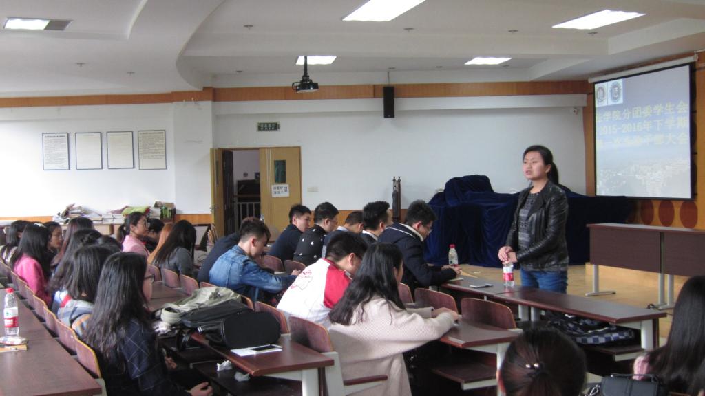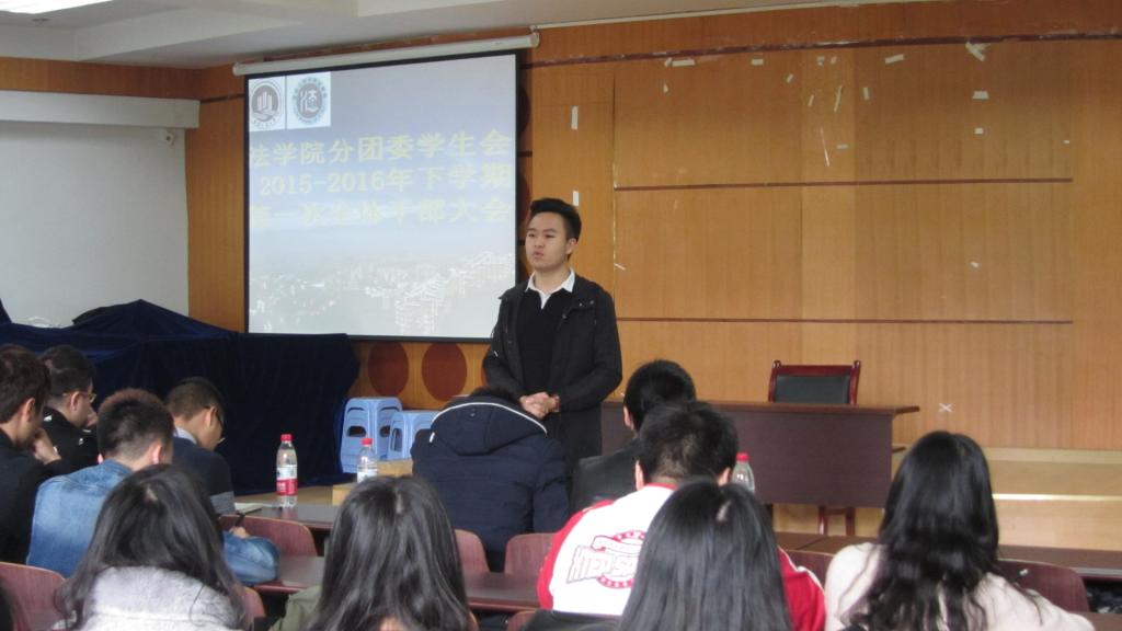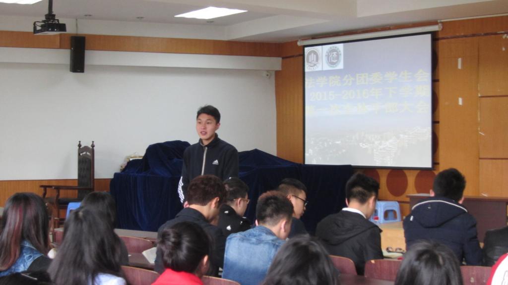 伴随着和煦的春风,结束了美好的寒假,工商的学子也逐渐回到学习的状态。2016年3月11日中午,法学院学生会在九教模拟法庭举行了本学年第一次全体会议,法学院分团委书记杨婷老师、副书记覃橹宾及学生会主席团出席了本次会议,法学院学生会全体干部干事参加了会议。