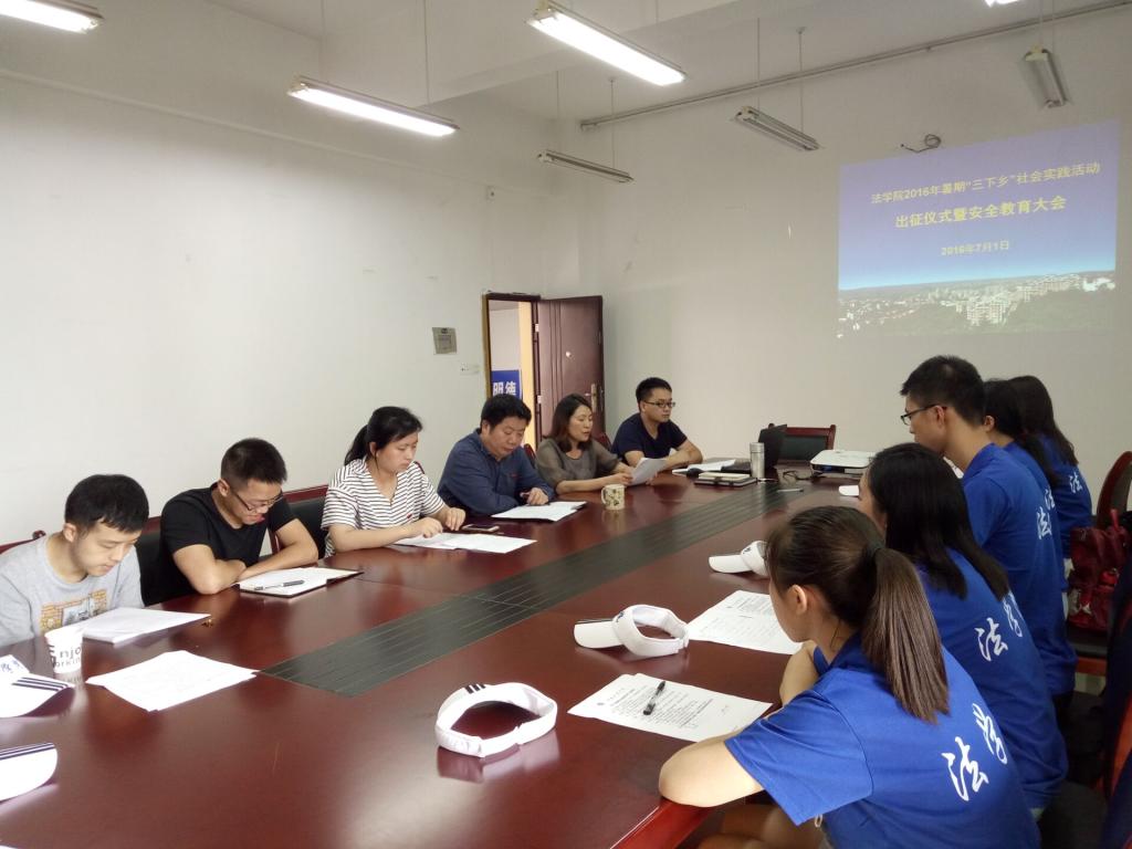 为深入学习宣传贯彻习近平总书记关于青年成长成才的一系列重要论述,引导和帮助广大青年学生在社会实践中受教育、长才干、作贡献,法学院市级重点团队——理论普及宣讲团于7月1日下午在慧智楼90429会议室召开2016年暑期“三下乡”社会实践活动启动仪式。学院党总支书记李自维教授、院长杨和义教授、副院长刘勇教授、分团委书记杨婷老师、辅导员刘鑫老师、罗观老师以及全体社会实践团成员出席了本次启动仪式。启动仪式受到了网易、视界网等多家媒体的报道。