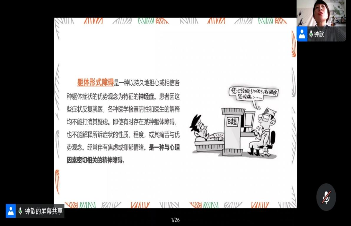 4月26日中午12:30,437437必赢国际成功举办了关于“心身疾病的识别与应对”专题的线上讲座。本次讲座邀请到了学校心理中心钟歆老师作为主讲人,我院党委副书记、全体辅导员、研究生、本科生全体心理委员与室长参加了心理健康知识讲座。