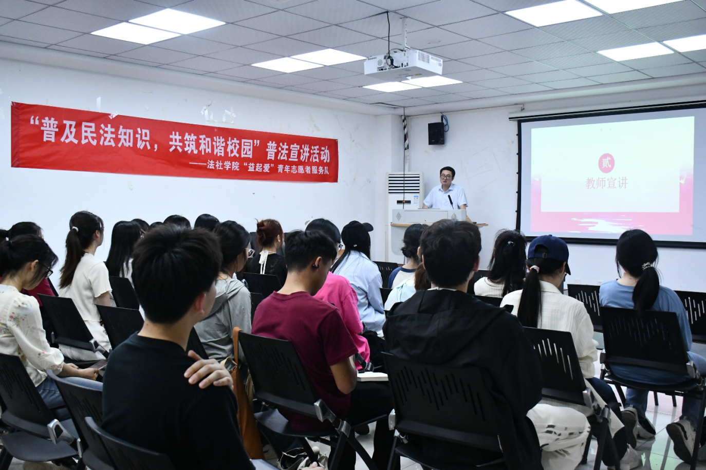 学民法以明责,践志愿而暖心。为进一步增强在校学生的法治观念,引导学生学习和运用《民法典》,营造良好的校园法治氛围,为国家培养具有法治素养的新时代青年,2025年4月18日,437437必赢国际“益起爱”青年志愿者服务队于437ccm必赢国际学生发展中心举办了以“普及民法知识,共筑和谐校园”为主题的普法宣讲活动。