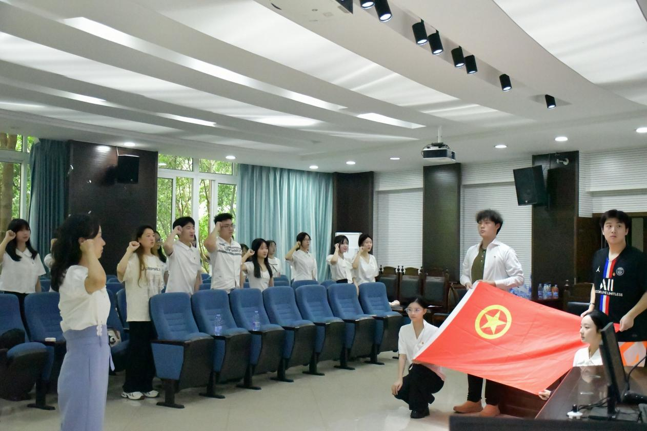 活动在庄严的国歌声中拉开序幕,主持人刘家琳宣读了2025年新团员名单,并对入团仪式的重要意义作出阐释。随后,何祖润为5位新团员代表颁发团章、团员证和团徽,带领所有新团员进行入团宣誓,铿锵的誓词彰显了新团员们坚定不移的信念和勇担使命的决心。
