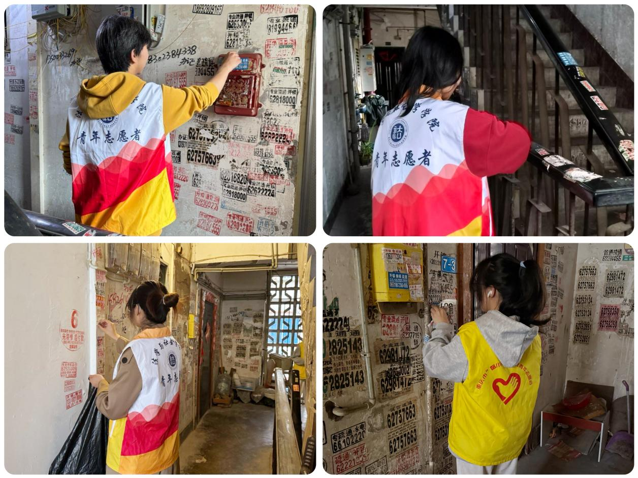 志愿整装赴社区,躬身清扫践初心。志愿者们手持扫帚、钳子、抹布等工具,对公共区域地面、楼梯扶手和墙面小广告一一清理,彻底清洁社区内的卫生死角。整个过程志愿者们分工明确、配合默契。活动结束后,全体志愿者整理工具,合影留念。