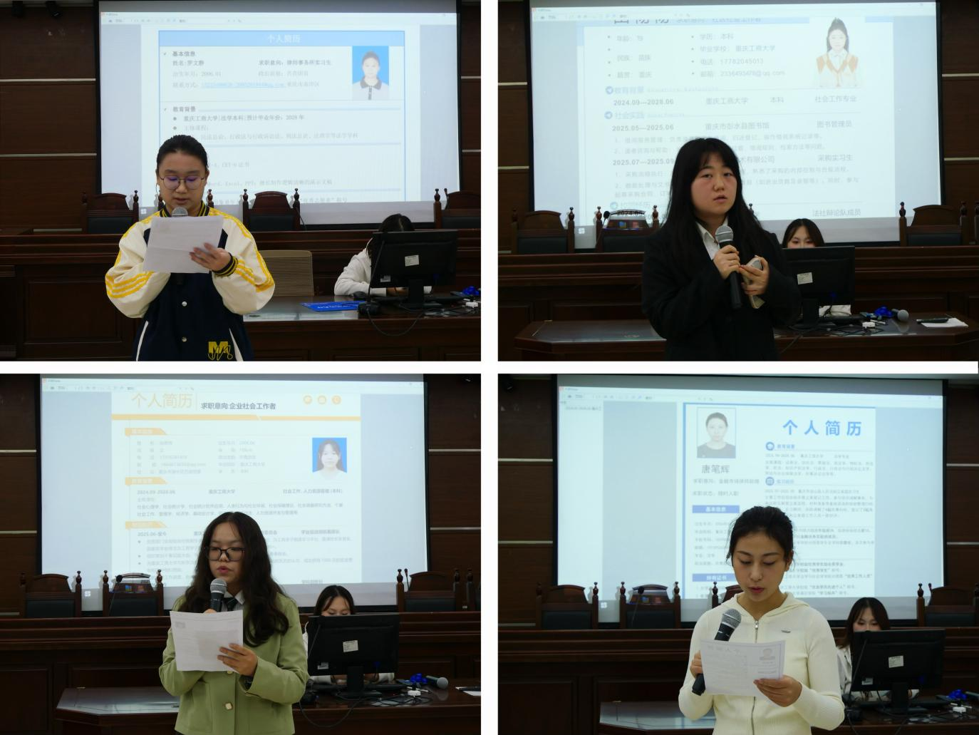 比赛现场,参赛选手们精心设计的简历作品风格多样、亮点纷呈。8名选手从2024级各班级班赛脱颖而出进入院赛,他们的简历紧扣法学、社会学两大专业特色,将学科理论知识与实习实践、志愿服务等经历深度融合,清晰展现出专业优势与成长轨迹。评委老师从内容完成度、专业匹配度、设计创意性及求职导向性等多个维度进行评审,在肯定优秀作品的同时,更针对每份简历的细节优化、亮点提炼给出精准建议,为参赛学生和现场观众带来了极具价值的指导建议。