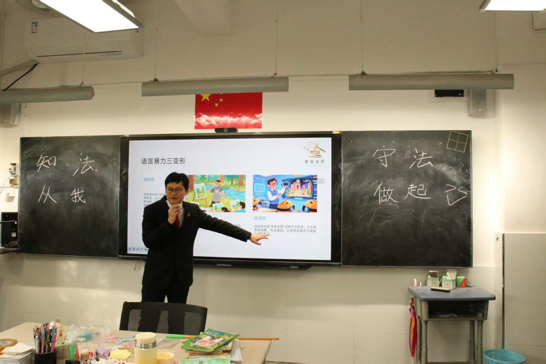 11月21日下午,437437必赢国际律动青年法学社联合学院共建单位巴南区人民法院共同走进江南小学,为一年级学生开展了“知法守法,从我做起”主题普法课程活动。