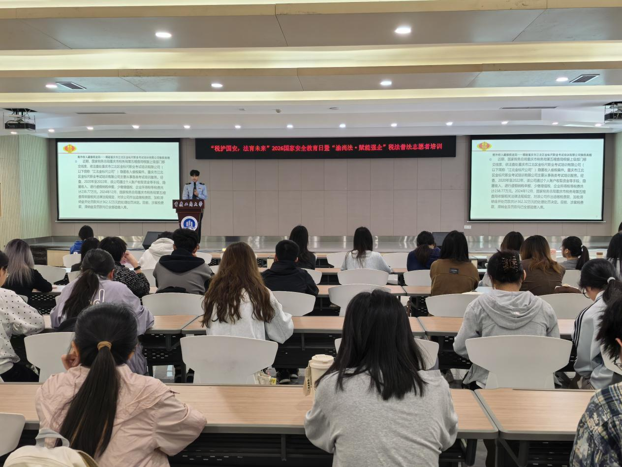 本次活动分为“校园普法宣讲”与“法律义务咨询”两大板块。在普法宣讲环节,重庆经济技术开发区税务局业务骨干主讲《大学生必备税法知识》,内容紧密结合校园生活场景,深入拆解了大学生实习劳务报酬个税申报、校园创业优惠政策等实用税法要点。随后,重庆市税务局第五稽查局业务骨干围绕涉税违法典型案例及个人信息保护进行专题讲解,通过真实案例警示风险,引导同学们在涉税活动中增强防范意识,筑牢信息安全防线。