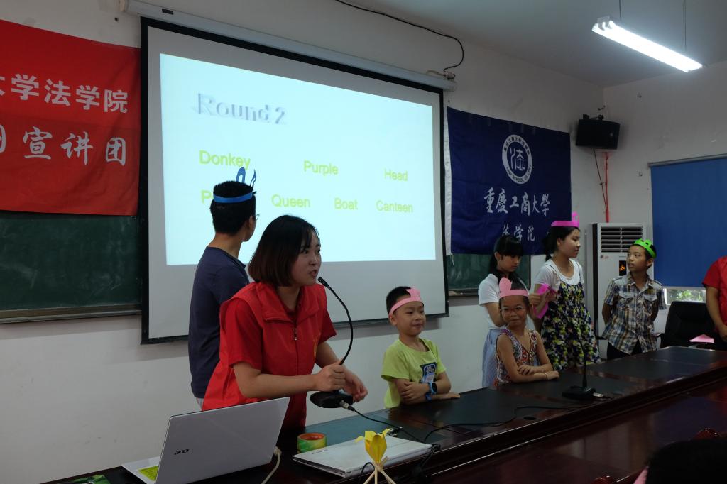 在少儿英语课程的第二个环节当中,志愿者们将传统的儿童游戏“萝卜蹲”改编为英语版本,将游戏融入课堂教学。游戏规则是——每组推选出一个小朋友代表本队组和其它组进行PK,一共进行两轮比试,最终的优胜队伍获得相应的奖励。小朋友们的参与度非常高,年龄的差距也挡不住小朋友们参与的热情;初中生充分发挥出自己基础好的优势,年龄小的小朋友也凭借自身的聪明灵动毫不示弱。