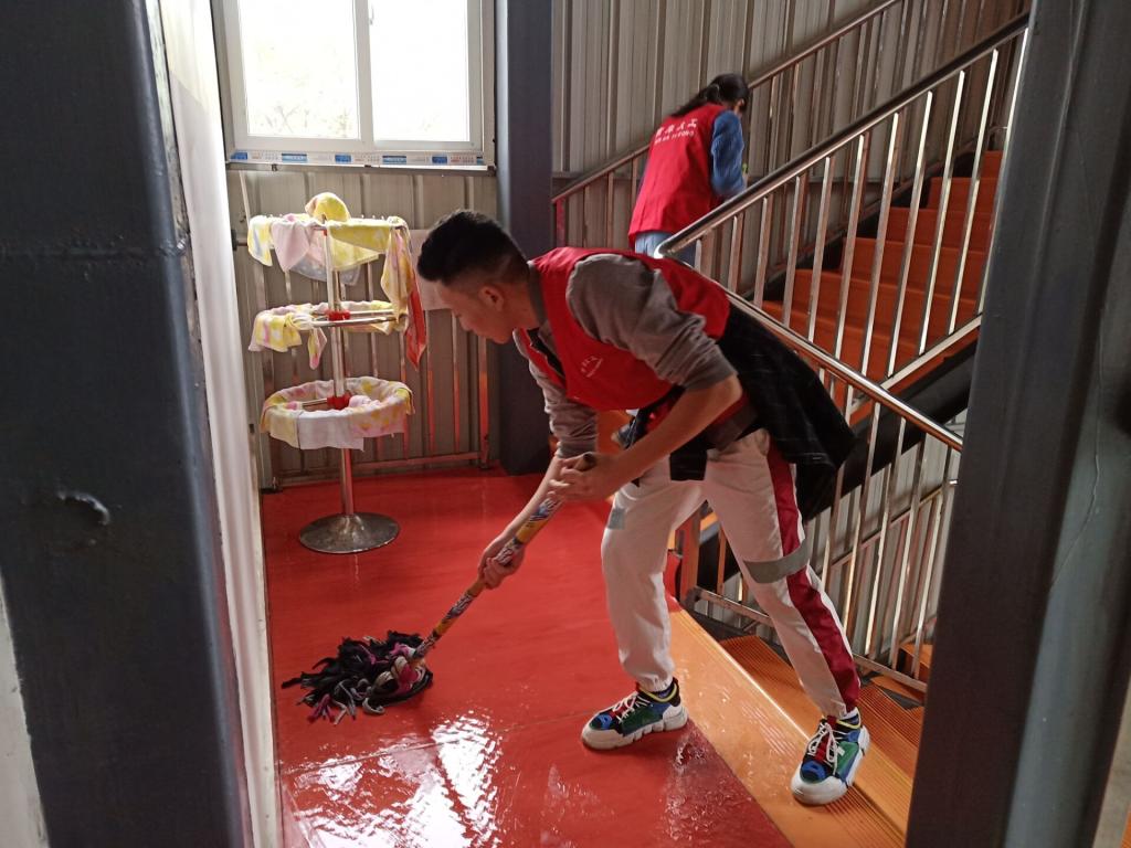 由于天气原因,志愿者作出了明确的分工。上午帮助他们打扫卫生,有的为孩子们的过道和楼梯进行了消毒,给他们提供了一个干净卫生的生活环境;有的在厨房打扫卫生,保障孩子的饮食卫生。志愿者们团结协作,很快就完成了任务。紧接着志愿者们来到活动教室,用自己的热情和耐心陪小朋友们唱歌跳舞,很快就和小朋友们打成一片。午休时间到了,志愿者们自发地协助幼儿园老师为小朋友们脱衣睡觉。简短的午休时间,志愿者们也好好休息了一下。下午安排的任务是陪小朋友们外出玩耍,在和小朋友玩耍的过程中,小朋友们就像小天使一般,活泼可爱。每一位志愿者也是非常用心负责,不怕苦不怕累,认真贯彻了志愿者的宗旨。