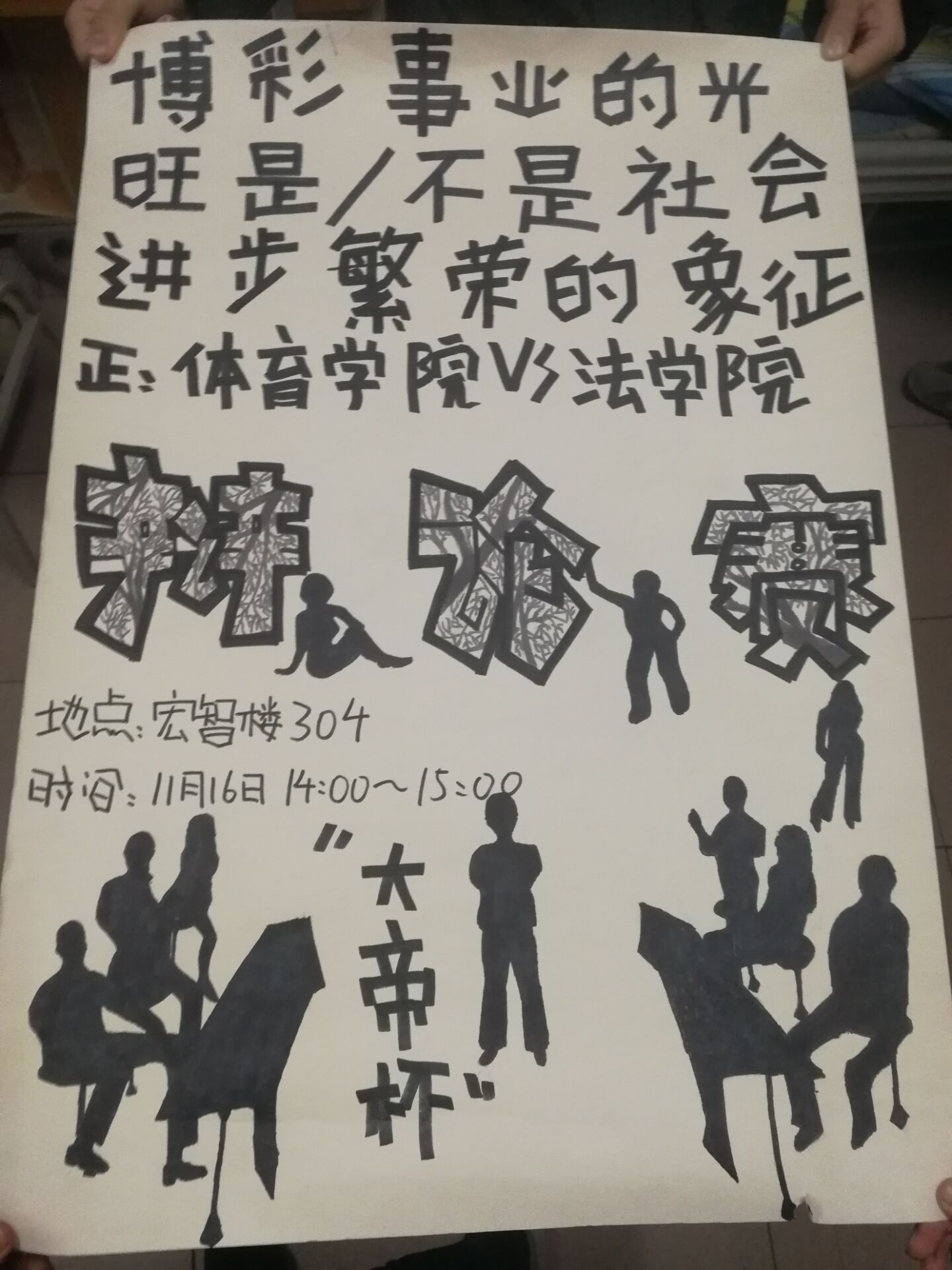 11月9日下午2点半,小组赛法学院对阵数统学院。比赛开始后,我院学子率先陈词,表述我方立场,随之你来我往,双方各展所能进行言语和思维的交锋,随着正方法学院四辩同学最后的总结陈词,这场辩论赛落下了帷幕。经过评委老师们严谨的评分过后,法学辩论队的同学以五比零的票数获得了该场比赛的胜利。赛后经抽签,法学院的下一场比赛将面对体育学院,由于体育学院在第一轮憾负数统学院,只要法学院下一轮能成功取胜,小组赛就将顺利出线,在积极准备下一周的辩论比赛中,法学辩论队收到来自组委会的消息,体育学院因参加工商杯的辩手不够,选择弃赛。