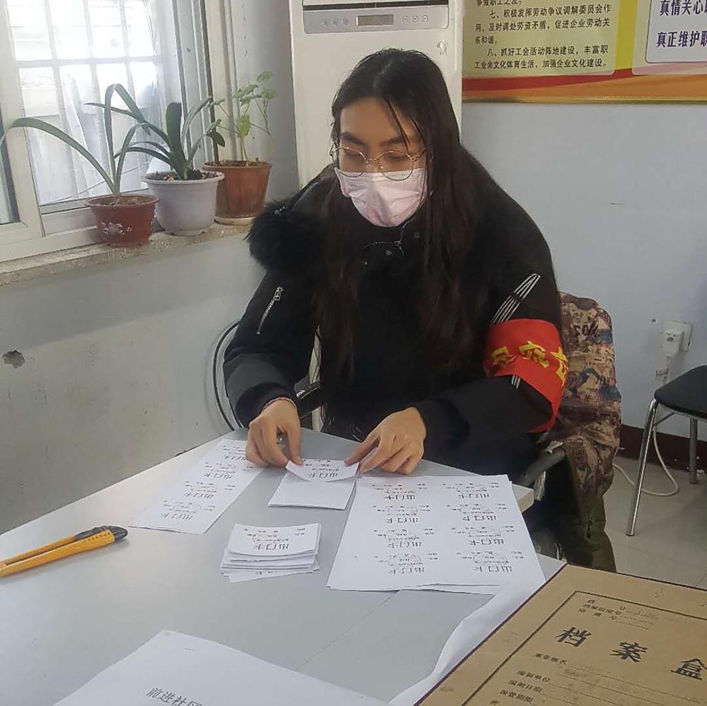 她加入了疫情防控党员突击队,负责劝导社区居民违反秩序的行为,宣传疫情防控知识,联系隔离居民并实时记录,排查社区进出车辆及人员,为社区隔离人员购买体温计和生活用品。