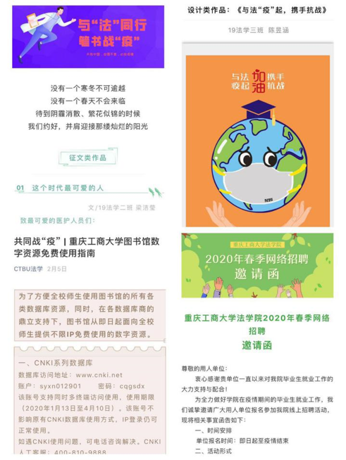 学院引导同学们结合专业将所学用于所思所想,保持专业敏感性,开展“与‘法’同行 笔书战‘疫’”原创网络文化作品征集活动,让同学们体悟到作为法学学生的社会担当。学院官方微信公众号开设“共同战疫”和“线上资源”栏目,尽可能回应现实问题,为同学们提供线上学习资源和就业信息。