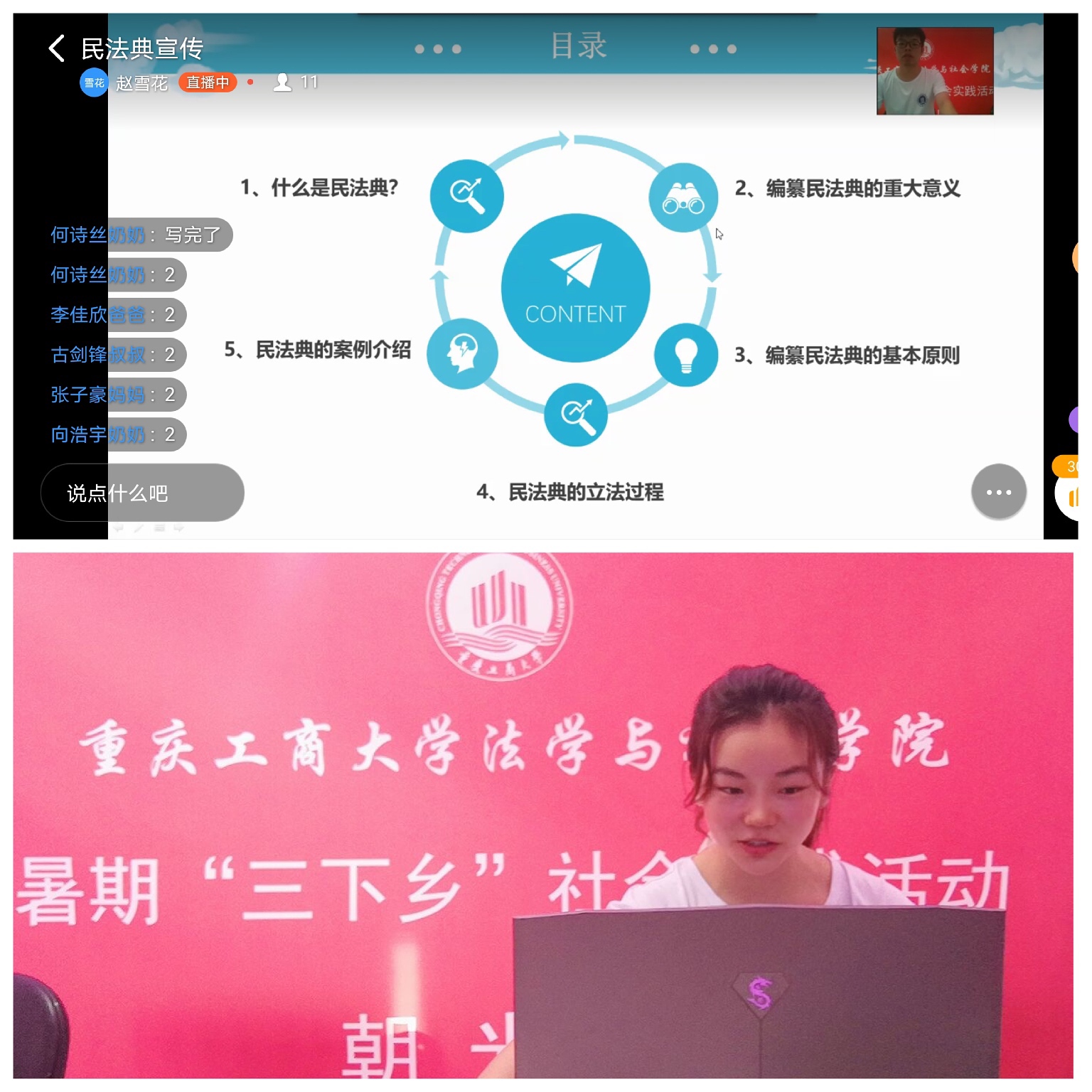 为了更好地利用专业所学送《民法典》下乡,大学生志愿者们深入学校,在线上为河屯村小学的学生开设《民法典》直播课程,在直播课的互动过程中着重提高小朋友们对自身权利的了解和对国家法治社会建设的认知。大学生志愿者们还自制了简单易懂的民法典手册,走进集市和社区进行大面积的《民法典》宣讲,对从9岁到75岁的人生中可能遇到的侵权行为都进行了举例说明。在走访宣传的过程中,很多对于《民法典》并不了解的村民渐渐开始对《民法典》产生了浓厚的兴趣。针对村民们普遍关心的物权法问题志愿者们进行了着重讲解,也为村民们提供了更多了解《民法典》的途径,指导村民通过抖音等手机APP关注了《民法典》的相关公众号。