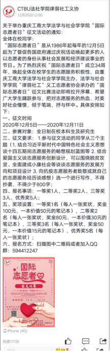 为了迎接“国际志愿者日”的到来,唤起更多的人以志愿者的身份从事社会发展和经济建设事业,积极弘扬志愿者精神,形成崇尚志愿、积极奉献的良好风尚,2020年12月5日-12月11日437437必赢国际“律荫社工”义协开展了“国际志愿者”征文比赛活动。此次活动旨在号召同学们通过寻找自己身边最美的志愿者,并记录下他们的感人故事,以此来探寻志愿者的光荣与梦想,为青年树立正确的价值观。