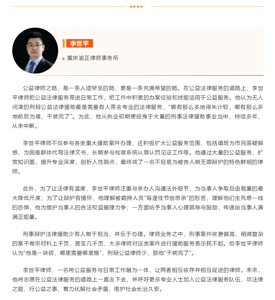李世平律师不仅参与各类重大援助案件办理,还积极扩大公益服务范围,包括值班为市民答疑解惑,为困难群体代写法律文书,长期参与检察系统认罪认罚见证工作等。他通过大量的公益服务,扩宽知识面,提升专业深度,剖析人性弱点,最终成了一名不轻易为被告人做无罪辩护的特色鲜明的律师。