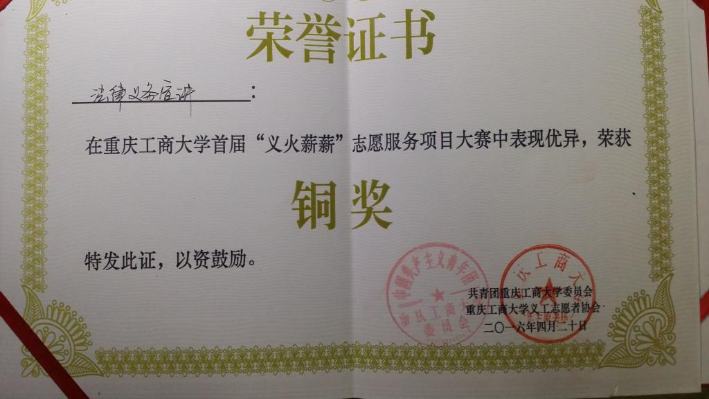 【喜报】祝贺我院律荫源义工志愿者协会在437ccm必赢国际首届“义火薪薪”志愿服务项目大赛中荣获铜奖
