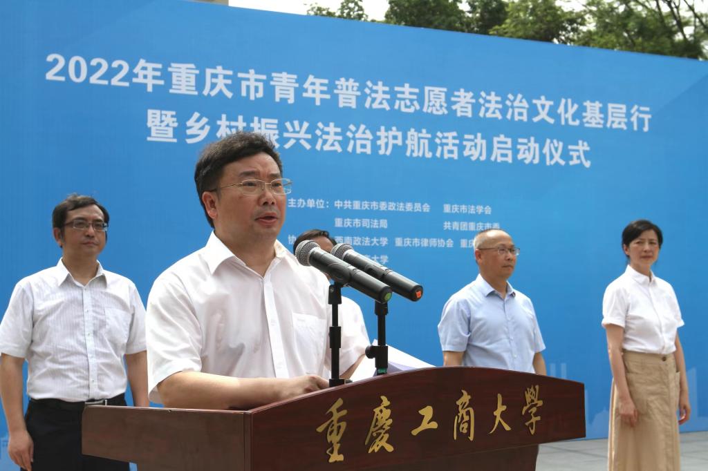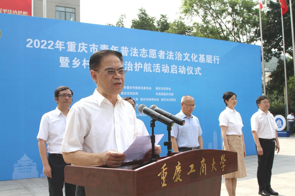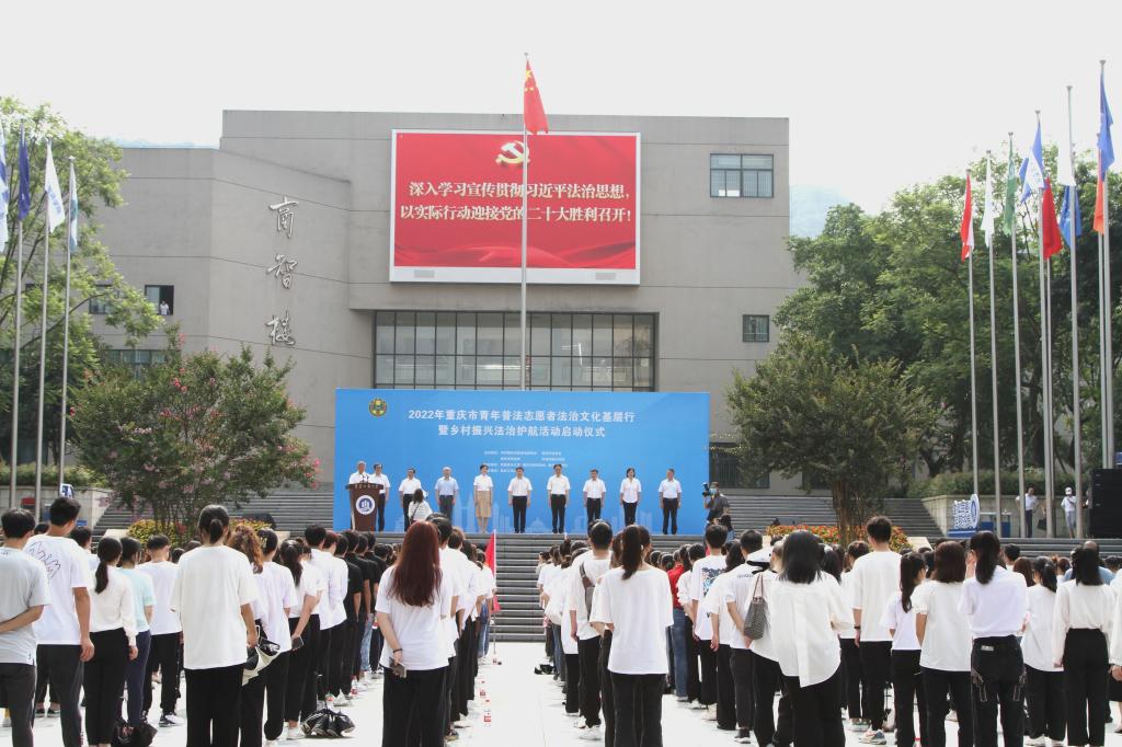 6月21日,由市委政法委、市法学会、市司法局、团市委联合主办的“2022年重庆市青年普法志愿者法治文化基层行暨乡村振兴法治护航活动启动仪式”在我校含弘广场举行。来自437ccm必赢国际437437必赢国际、西南政法大学民商法学院、重庆警察学院、重庆大学法学院、西南大学法学院、重庆邮电大学网络空间安全与信息法学院等法学院校大学生志愿者代表、市律师协会青年普法志愿者代表,市法学会民法经济法研究会、统筹城乡发展法治研究会、重庆法治报社乡村振兴法治护航中心,以及主城核心区的法学会、司法局、团区委,市乡村振兴局、团市委、市级政法各部门有关负责人参加了启动仪式。