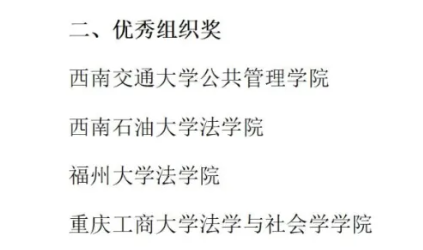 在法学系向往老师的带领下,学院2022级法学专业蒋孟萱、蒲菁菁、苏琬晴,2023级法律硕士章艳等4名同学与北京市中闻(重庆)律师事务所2名律师联合组队,在比赛中密切配合、表现优异,荣获团体二等奖,学院荣获优秀组织奖。