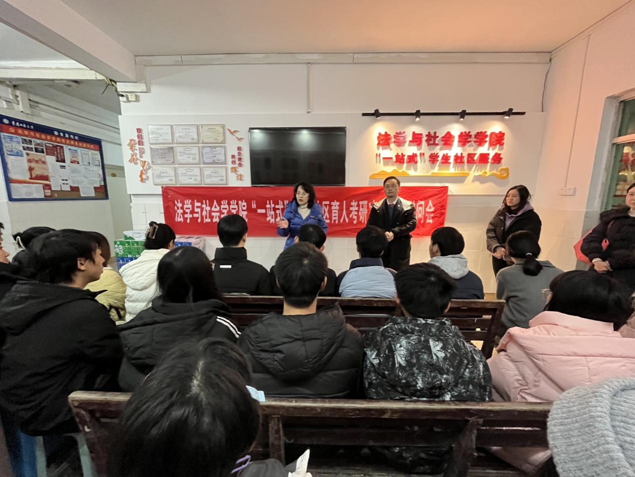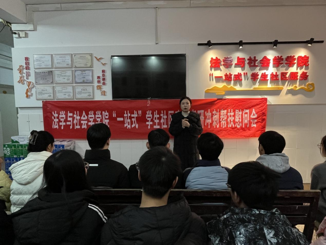 在2025届全国硕士研究生招生考试临近之际,2024年12月13日上午,437437必赢国际“红岩先锋”变革型实践教学组织“社会工作坊”在南区10栋宿舍楼大厅举办“一站式”学生社区育人考研冲刺慰问会。学院党委书记李莉莎、院长刘勇、专职组织员古纯玉、学工办主任何祖润、2021级学生辅导员杨威、研究生辅导员刘玲馨、“社会工作坊”党员教师王璐到场参会。