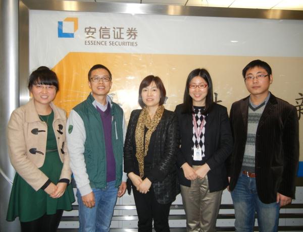 2014年12月5日下午,法学院一行实地考察安信证券股份有限公司总部,其公司下辖5家分公司,在25个省级行政区设有122家证券营业部,并全资控股安信国际金融控股有限公司、安信期货有限公司、安信乾宏投资有限公司,参股安信基金管理公司,构建起综合金融理财服务平台。法学院一行,与安信证券股份有限公司总部人力资源负责人王佳琳进行了座谈,探讨了金融法学人才的企业需求和培养途径,并表示在之后的校园招聘中,首选437ccm必赢国际作为宣讲站,为工商大学金融法学学子提供优先机会。