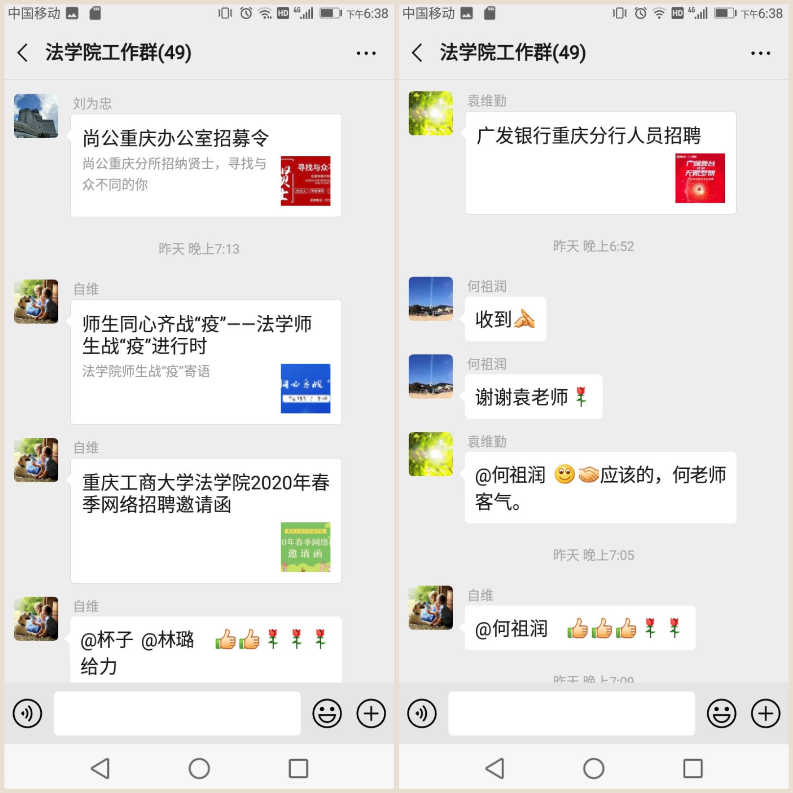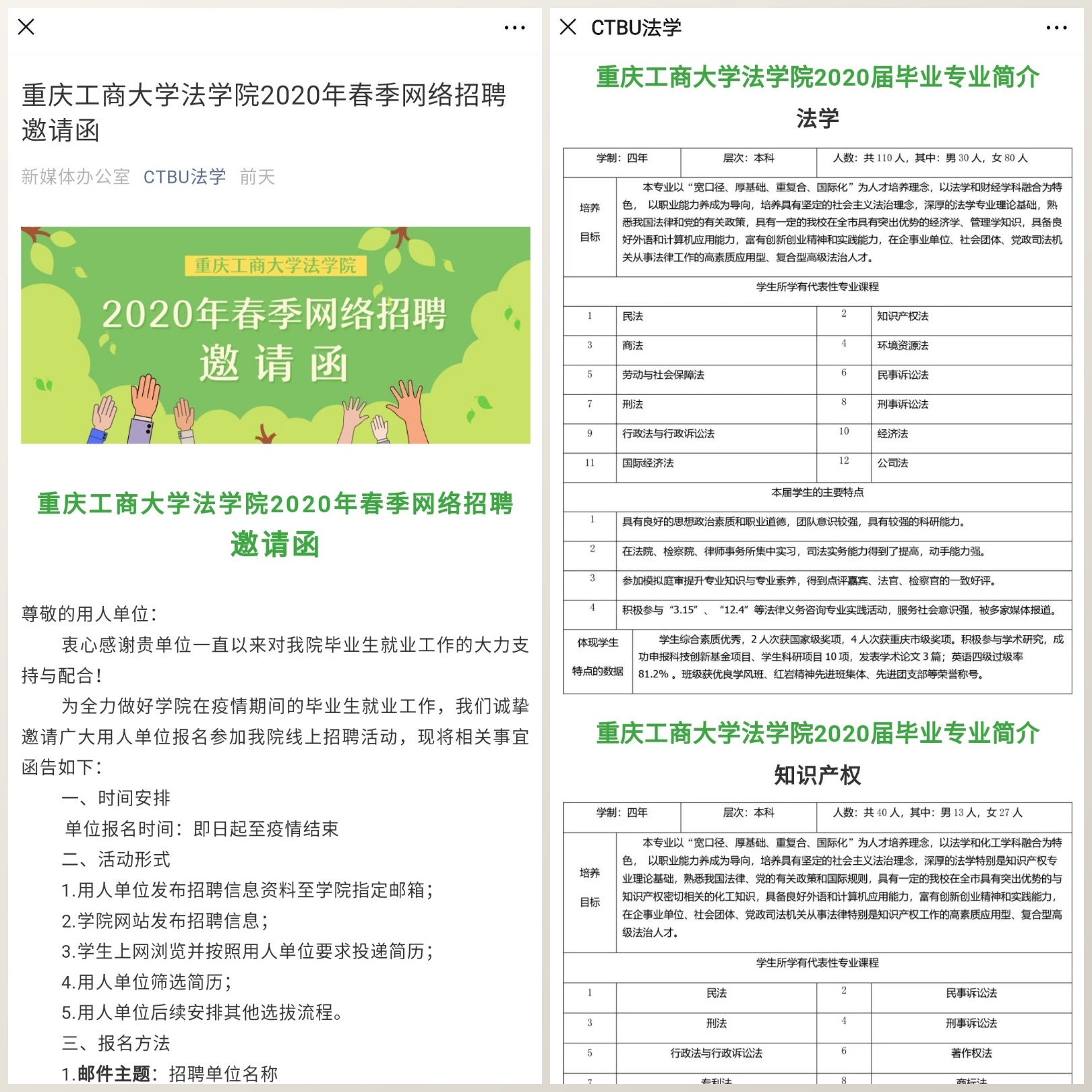 学院开启就业指导网络化服务工作。面对突如其来的疫情,聚集型的春招大潮无法按原计划进行,毕业生找工作陷入困境。为全力做好在疫情期间毕业生就业工作,学院开启就业指导网络化服务模式,线上邀请合作单位开展法学院2020年春季网络招聘会活动,搭建用人单位与学生的求职平台。同时,学院微信公众号开辟线上就业专栏,充分挖掘全院教师社会资源,老师们齐心协力想办法,学院收集发布就业信息,为毕业生提供服务。辅导员老师们利用网络平台和线上方式了解每位同学的就业需求,并对学生求职简历、求职礼仪等进行指导,对贫困学生、就业困难学生等进行一对一重点帮扶。总之,毕业生可以通过微信群、QQ群、公众号、咨询电话等各种途径,随时获取就业相关信息。