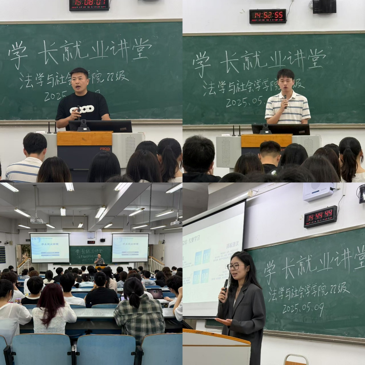 此次学长就业讲堂邀请到2025届成功考研、就业、考公的毕业生代表梁雍绮、张自豪、苏永鹏、严灿作经验分享。梁雍绮从学习进度、调剂过程、学习心态等方面做了详细介绍,张自豪从双考时间规划、考研专业课等方面总结经验,苏永鹏从岗位选择、面试技巧等方面做出分享,严灿通过经验贴展示的方式倾囊相授就业经验,多样化就业路径助力同学们明晰不同选择的准备要点。