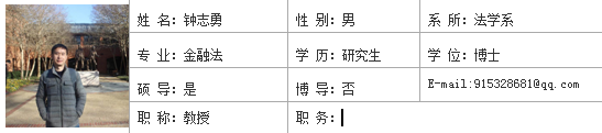 社会任职重庆市人大常委会立法咨询专家 讲授课程本科生:《国际法》、《国际经济法》等研究生:《票据法专题》、《银行法专题》等研究方向金融法个人简历教育背景1999/9-2002/6,厦门大学法学院攻读博士学位 1993/9-1996/6,陕西师范大学历史系攻读硕士学位,期间获英语自考本科文凭 1984/9-1987/6,岳阳师范学校(中专) 工作经历 2016/7-,437ccm必赢国际任教 2007/7-2016/6,南昌航空大学任教,期间受国家留学基金委资助在牛津大学法学院访学1年 2002/7-2007/6,中南大学任教,期间在商学院管理科学与工程博士后流动站做研究2年 1996/7-1999/8,天津大学任教 1987/7-1993/8,湖南省湘阴县南湖中学任教,期间获英语自考专科文凭 近年来讲授的主要课程 主要讲授课程为《国际法》、《国际经济法》、《票据法专题》等课程 个人荣誉学术成果:论文1、《电子支付市场监管问题比较研究》,独著,《河北法学》2018年第4期 2、《电子支付市场准入制度完善论》,独著,《上海金融》2018年第6期 3、《自由融资权与行政权的法律平衡》,独著,《行政论坛》2014年第3期(CSSCI来源期刊) 4、《自由融资权与刑罚权的冲突及解决》,独著,《刑法论丛》2014年第1期(CSSCI来源集刊) 5、《论中国民航销售代理业务管理法制之完善》,第一作者,《北京航空航天大学学报(社会科学版)》2011年第6期(CSSCI扩展版) 6、《银行卡责任承担规则之民法分析》,独著,《金融与经济》2009年第4期(北大核心期刊) 7、《网上支付中的风险承担机制研究》,独著,《上海金融》2007年第11期(CSSCI来源期刊) 8、《网上支付中的民事责任研究》,独著,《法学论坛》2007年第5期(北大核心期刊),全文转载于人大复印资料《民商法学》2007年第12期 9、《电子货币若干法律问题研究》,独著,《河北法学》2007年第9期(CSSCI来源期刊),全文转载于人大复印资料《经济法学》2007年第10期 10、《美国证券集团诉讼与我国证券民事诉讼形式之完善》,独著,《现代财经》2005年第11期(CSSCI来源期刊),全文转载于人大复印资料《诉讼法学》2006年第4期 11、《证券民事侵权诉讼前置程序与共同诉讼》,独著,《法律科学》2003年第6期(CSSCI来源期刊) 12、《网上支付中的消费者保护问题》,独著,《国际贸易问题》2002年第5期(CSSCI来源期刊),全文转载于人大复印资料《经济法学》2002年第8期 学术成果:著作 1、《电子支付服务监管法律问题研究》,独著,中国政法大学出版社2018年版 2、《网上支付中的法律问题研究》,独著,北京大学出版社2009年版 3、《跨国银行总行与海外分行法律关系论》,独著,中国方正出版社2005年版 学术成果:课题 1、主持《银行卡清算产业反垄断法规制研究》(17BFX104),国家社科基金一般项目,2017-2020 2、主持《非金融机构支付服务监管法律问题比较研究》(12YJA820103),教育部人文社科基金项目,2012-2014 3、主持《新农村建设中的金融法律制度改革与创新》(08FX14),江西省社科规划课题,2008-2010 4、主持《美国证券集团诉讼研究》,上海证券交易所联合研究计划第11期课题,2004 5、主持《网上支付中的法律问题研究》,中国法学会重点课题,会研字[2003]3号,2003 学术成果:获奖 独著《网上支付中的法律问题研究》于2011年获江西省第十四次社会科学优秀成果奖二等奖 |